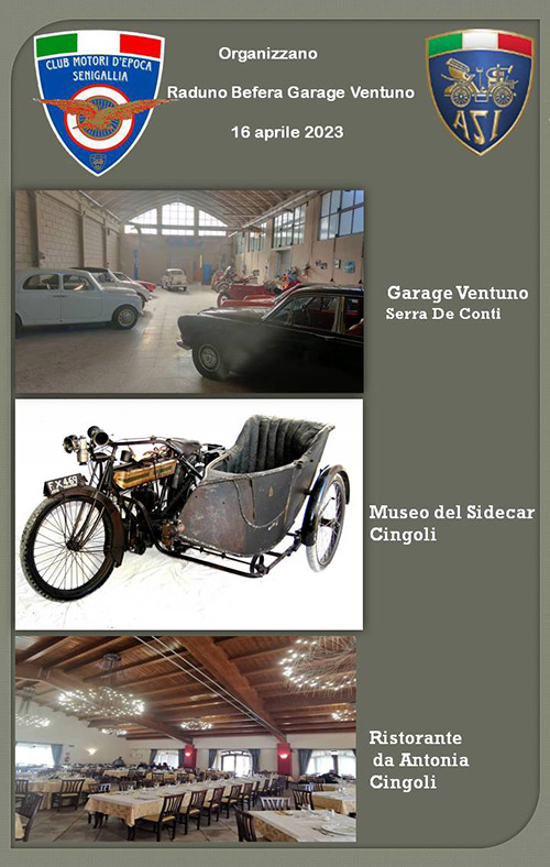 ORE 9 - Partenza per la località Osteria frazione di Serra de’ Conti, per recarsi presso il Garage 21, del sig. BEFERA, dove possiamo vedere la mitica collezione di MOTO ed AUTO,. Mentre i nostri occhi vedranno i veicoli storici, il nostro palato degusterà un generoso spuntino offerto dal sig. Befera e dalla sua gentile Signora.